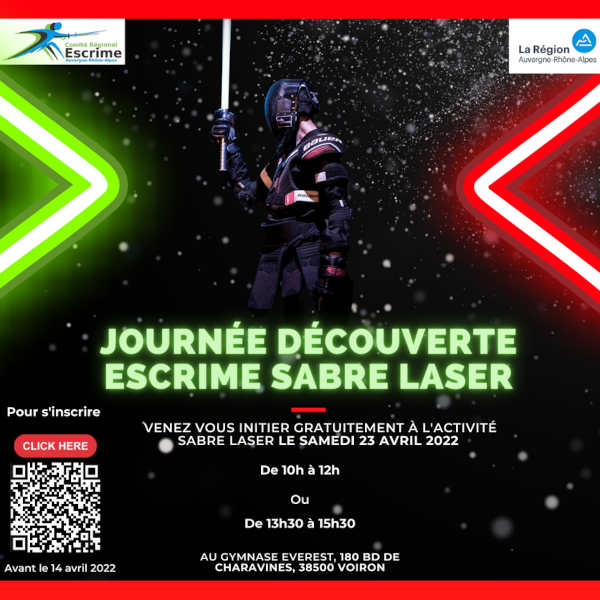 Enfant, jeune ou adulte : venez vous initier gratuitement à l’activité Sabre Laser, le samedi 23 avril 2022, soit le matin (10-12h), soit l’après-midi (13h30-15h30)